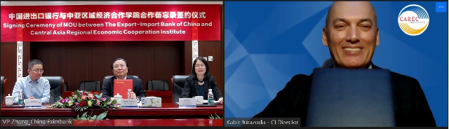 12月27日,进出口银行副行长张文才与中亚区域经济合作学院(以下简称中亚学院)院长卡比尔·朱拉佐达举行线上会谈并签署双方合作谅解备忘录。